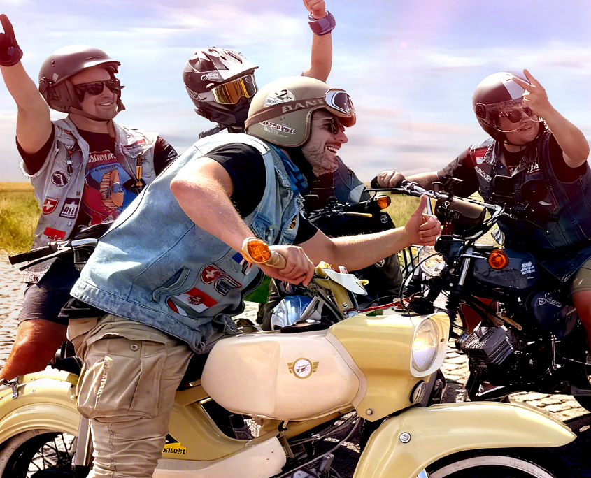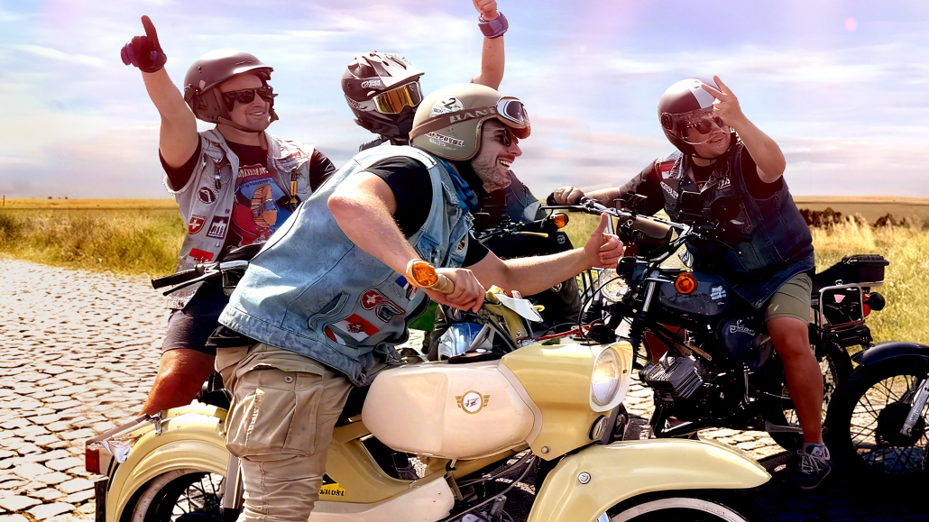 8 Freunde mit ihren Mopeds auf großer Tour